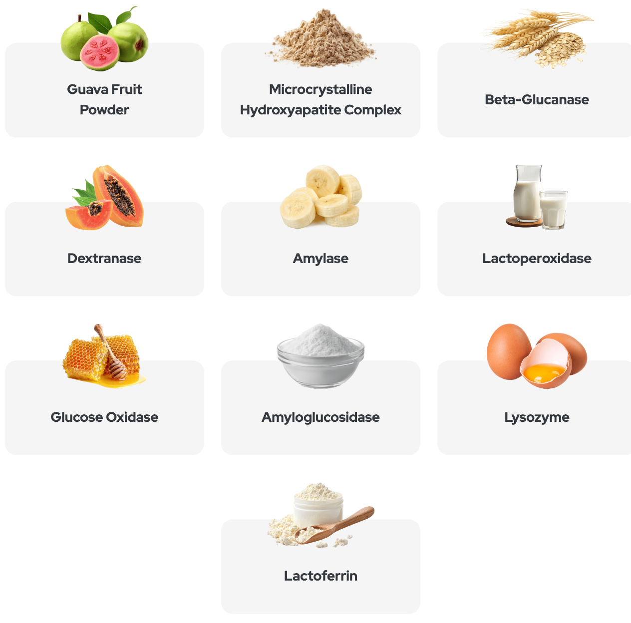 Additionally, ingredients like Lactoperoxidase, Glucose Oxidase, Lysozyme, and Lactoferrin provide natural antimicrobial support. They help control harmful bacteria while maintaining oral microbiome balance. Guava Fruit Powder, rich in natural antioxidants, completes the formula by supporting healthy gums and daily inflammatory defense.